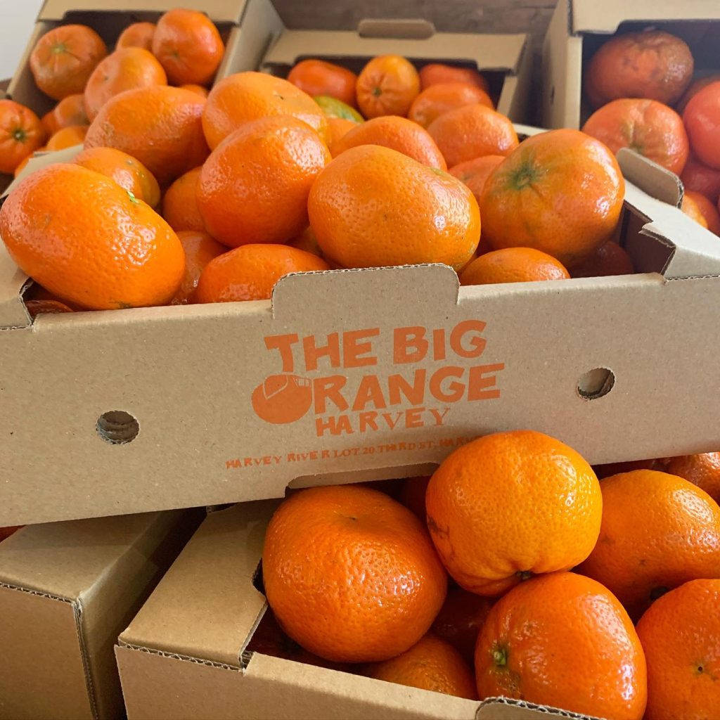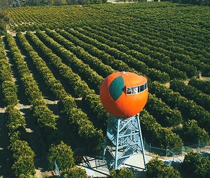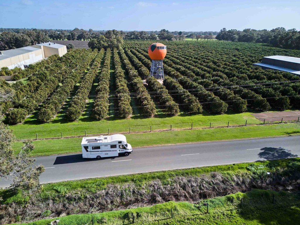 Big Orange sits atop a 10-metre tower, with an additional 4-metre climb (62 steps) to a viewing platform inside the orange. Harvey’s history and photos can be viewed inside The Big Orange.